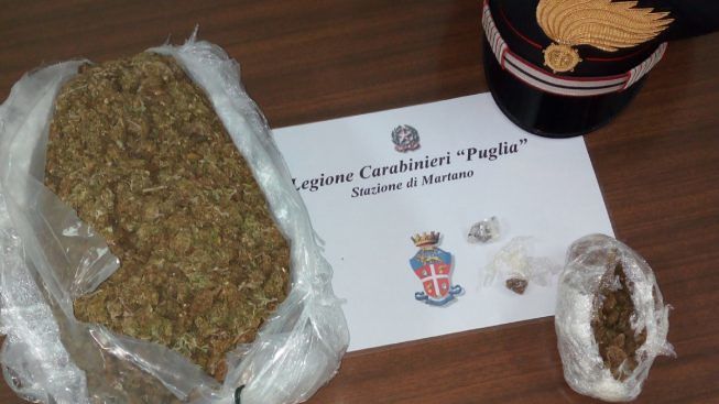 Stanotte i Carabinieri della Stazione di Martano, nell’ambito di uno specifico servizio finalizzato alla repressione dello spaccio di stupefacenti, hanno arrestato Salvatore Solombrino, classe 56, volto già noto alle Forze dell’Ordine per reati contro la persona, contro il patrimonio e in materia di droga. L’uomo, che era agli arresti domiciliari da dicembre scorso, a seguito di una perquisizione personale e domiciliare presso la sua abitazione di Castrignano de’ Greci, è stato trovato in possesso di quasi un chilo di marijuana, nascosta in una busta in cellophane all’interno della camera da letto. Solombrino, pertanto, è stato arrestato con l’accusa di detenzione ai fini di spaccio di sostanza stupefacente e accompagnato presso la Casa Circondariale di Lecce a disposizione dell’Autorità Giudiziaria.