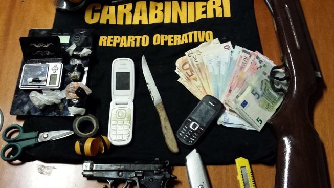 All’esito della perquisizione domiciliare a carico del fermato sono stati rinvenuti circa 700 gr. di marijuana suddivisa in due panetti; una pistola modificata calibro 7,65 di fabbricazione slava, completa di serbatoio e 6 cartucce; un fucile ad aria compressa; la somma contante di 1790 euro; materiale vario per il confezionamento delle dosi.