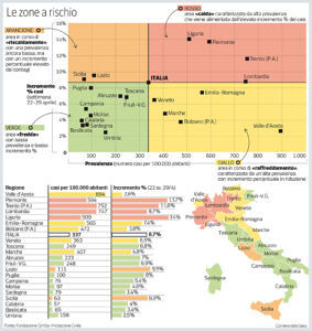 Poi c’è il riquadro giallo: qui stazionano Veneto, Emilia Romagna, Valle d’Aosta e la provincia autonoma di Bolzano. In queste zone il contagio è in corso di raffreddamento, ma la percentuale di incremento di nuovi casi non fa stare ancora tutti tranquilli.
