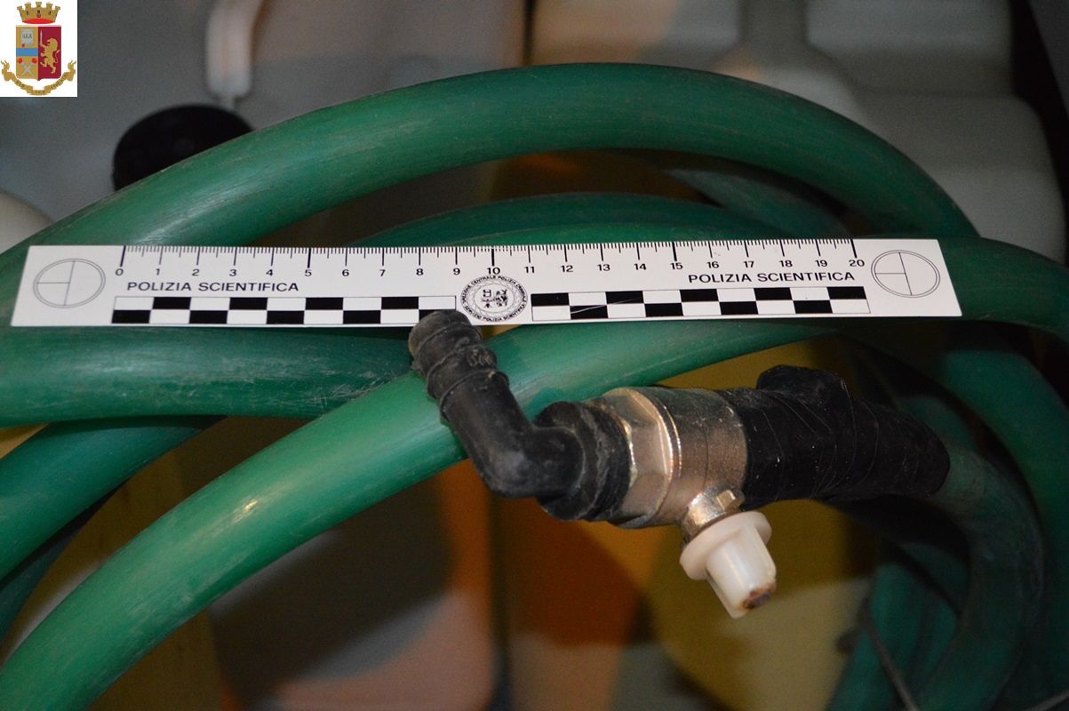 Il volto coperto e l’azione fulminea hanno spinto gli agenti ad entrare in azione, con la stessa ‘fretta’. Fermate le due guardie, è scattata la perquisizione nell’auto di servizio, dove sono stati trovati gli attrezzi del mestiere tipici dei ladri, non certo di chi dovrebbe vigilare contro di loro. Sono state trovate, infatti, 6 taniche in plastica contenenti residui di gasolio, un tubo in gomma, una scala in alluminio, una pinza a pappagallo e una torcia frontale.
