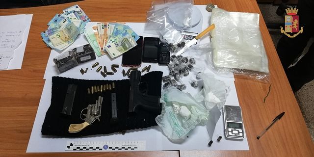 La perquisizione ha condotto al ritrovamento e al sequestro di 400 grammi di hashish, 94 grammi di hashish suddivisi in 20 dosi, 75 grammi di cocaina, una pistola semi-automatica calibro 9×21 con matricola abrasa, completa di serbatoio con 9 cartucce calibro 9×21, una rivoltella calibro 22 marca Volcanic modello V22 e la somma di 670,00 euro in banconote di vario taglio. E’ stato ritrovato anche materiale atto al frazionamento e al confezionamento di singole dosi di droga.
