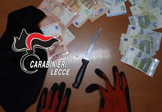 All’atto del fermo, a seguito di una perquisizione personale, sono stati rinvenuti un passamontagna; un coltello a punta; un paio di guanti e la somma in contanti 380,00 in banconote di vario taglio, provento del furto.