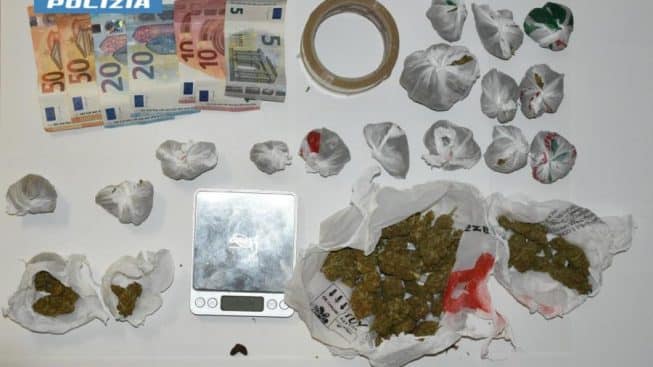 Appurata l’effettiva attività di spaccio, gli agenti si sono introdotti all’interno dell’abitazione dove, a seguito della verifica, è stata rinvenuta una scatola di scarpe contenente con all’interno involucri di cellophane, con all’interno marijuana, per un peso lordo totale pari a 147 grammi, un bilancino di precisione ed un mazzo di banconote di vario taglio, per la somma totale pari 165 euro, sottoposti a sequestro penale.