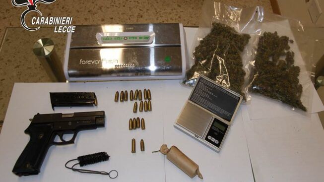 In seguito a una scrupolosa attività di ricerca, poi, i militari hanno trovato: una pistola marca SIG Sauer P220 cal. 9×21, con caricatore inserito contenente 6 proiettili calibro 9 Luger g.f.l., interrata, insieme a ulteriori 24 proiettili di vario calibro all’interno del vaso di una pianta ornamentale, tenuta sul balcone di casa. Inoltre è stato rinvenuto un artifizio pirotecnico del tipo “grosso petardo”.