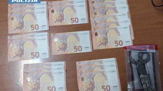 Tenuto conto del suo comportamento insofferente e agitato, i poliziotti, sospettando che il fermato potesse occultare qualcosa addosso o nel borsello in suo possesso, hanno deciso di procedere a una perquisizione personale. L’accertamento ha permesso di riscontrare nella tasca destra dei pantaloncini, un coltello a serramanico, della lunghezza totale di 21 cm e 20 banconote da 50 euro, che presentavano elementi e numeri di serie identici e ripetuti tali da poter ritenere le banconote contraffatte.