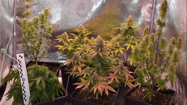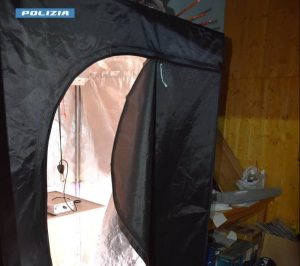 La perquisizione è proseguita all’interno dove, in una camera, c’era un grosso armadio di tela corredato di termo igrometro, ventilatore e faro, con all’interno sei vasi con piantine di “cannabis indica” a diversi stadi di crescita e nelle vicinanze tutta una serie di flaconi di fertilizzanti specifici e il necessario per la cura.