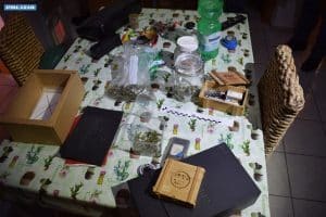 In cucina, all’interno del congelatore del frigo è stato rinvenuto un sacchetto di cellophane trasparente contenente circa 16 gr di sostanza vegetale, probabilmente dello stesso tipo, proveniente dalla coltivazione. Nella stessa stanza, nel mobile TV, sono stati trovati 2 bilancini di precisione, circa 2 gr di sostanza solida marrone riconducibile ad hashish, diversi barattoli chiusi e contenenti varie quantità di sostanza di tipo marijuana per un peso complessiva di circa 10 gr, sui mobili, poi, diversi steli essiccati, un vaso con una piantina e tutto l’occorrente (nastro isolante, bustine in cellophane), per la probabile preparazione delle dosi.
