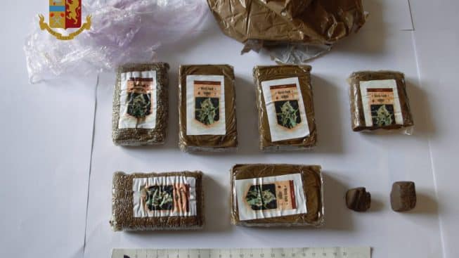 A questo punto, la perquisizione è stata estesa a un garage in uso al 40enne e presso la sua residenza e ha permesso di rinvenire altra sostanza dello stesso tipo. Sotto una pedana in legno all’interno del garage, infatti, gli uomini del Commissariato hanno rinvenuto 5 pezzi di hashish per un peso complessivo di 488,00 gr. e in un tappeto avvolto e riposto in un angolo di un vano attiguo alla residenza, un altro pezzo del peso di 67,70 gr e altri 4.07 gr all’interno della sua residenza.