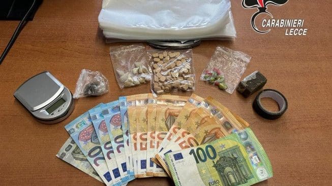 Nel corso di un servizio i Carabinieri del Nucleo Operativo e Radiomobile della Compagnia di Lecce hanno proceduto al controllo di un 40enne, già noto, originario della provincia di Taranto, ma residente a Lecce, il quale da subito ha assunto un atteggiamento che ha particolarmente destato l’attenzione dei militari, tanto da indurli a procedere a perquisizione personale e domiciliare. Durante le operazioni l’uomo è stato trovato in possesso di oltre 30 grammi di hashish suddiviso in panetti, 83 pasticche di ecstasy per un peso complessivo di circa 37 grammi e 13 involucri in cellophane termosaldati per un peso complessivo di quasi 8 grammi di Mdma. Parte dello stupefacente è stato rinvenuto sul tavolo della sala da pranzo, insieme a materiale vario per il confezionamento, mentre la restante parte era nascosta all’interno di un armadio situato nella camera da letto. L’uomo era in possesso anche della somma di oltre 600 euro suddivisa in banconote di piccolo e medio taglio; somma ritenuta provento di attività di spaccio. Per lui si sono aperte le porte del carcere “Borgo San Nicola” di Lecce dove rimarrà a disposizione della Procura della Repubblica che conduce le indagini.