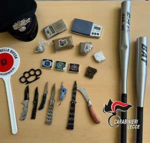 Altro positivo risultato è stato quello che ha portato all’arresto di due studenti 17enni, entrambi residenti in un comune dell’hinterland leccese. I due sono stati trovati in possesso di quasi 300 gr. di hashish suddivisi in sette panetti e 3 gr. di marijuana. Il tutto è stato rinvenuto nel corso di una perquisizione domiciliare eseguita presso l’abitazione di uno dei due, all’interno della quale i Carabinieri hanno anche trovato anche un bilancino di precisione, due mazze da baseball, un tirapugni e vari coltelli a serramanico di diversa tipologia e misura. Al termine delle operazioni di polizia, come disposto dal Pubblico Ministero di turno della Procura della Repubblica per i minorenni di Lecce, entrambi sono stati affidati ad un centro di prima accoglienza della provincia.