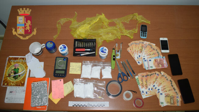 Durante la perquisizione, in particolare in cucina, è stata rinvenuta l’attrezzatura necessaria per il taglio e il confezionamento della sostanza stupefacente: forbici, cellophane, taglierini, nastro, bilancino di precisione, 4 cellulari, polvere bianca per il “taglio”, oltre a 2.700 euro in banconote di diverso taglio.
