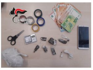 Sempre a seguito di un controllo presso l’abitazione e sulla persona, i Carabinieri hanno trovato 56,30 gr. di hashish e 3,2 gr di cocaina, oltre alla somma in contanti di 1.240 euro, un bilancino di precisione e materiale vario per il confezionamento.