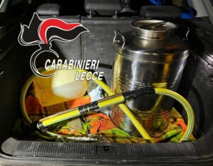 Nel corso delle verifiche, gli uomini della “Benemerita”, hanno fermato una Audi A3, di proprietà del 32enne e condotta dallo stesso e dopo una perquisizione hanno rinvenuto all’interno del portabagagli un bidone in metallo della capacità di 50 litri e una tanica di 10 litri, pieni di gasolio, rubato poco prima dal serbatoio di un escavatore di proprietà di una ditta, parcheggiato all’interno di un cantiere.