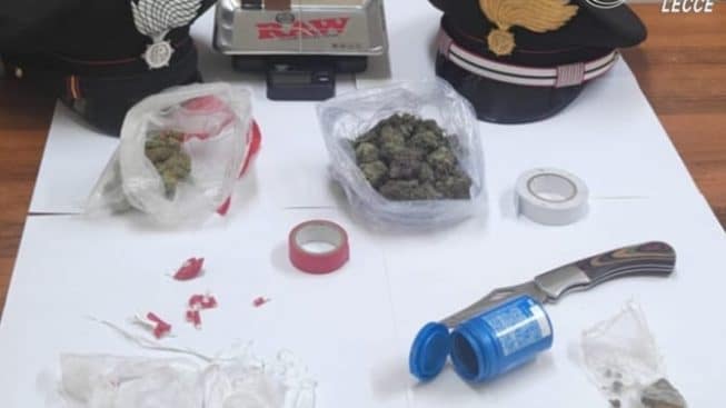 I Carabinieri della Stazione di Presicce-Acquarica, insieme ai colleghi della compagnia di Tricase, nella mattinata di oggi, hanno tratto in arresto in flagranza di reato un giovane del luogo poiché, a seguito di perquisizione domiciliare eseguita con l’ausilio del Reparto Cinofili dei Carabinieri di Modugno, all’interno della sua abitazione, hanno rinvenuto circa 80 grammi di sostanza stupefacente tra marijuana e hashish, oltre a materiale per il confezionamento e vari bilancini di precisione.