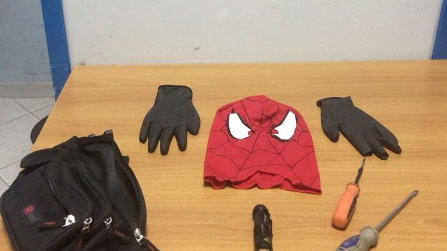 Nascosto dietro a un serbatoio, hanno trovato un uomo, con il volto travisato da una maschera in tessuto raffigurante il personaggio di Spider Man, che indossava guanti neri alle mani e un marsupio fissato alla cintura.