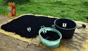 - 75 Kg. di esplosivo (“polvera nera”), proveniente da un ciclo illegale di produzione, così come riscontrato in flagranza dagli artificieri che hanno effettuato una campionatura materiale oltre che ad una prova empirica, avendo subito conferma che si trattasse di “polvere nera”