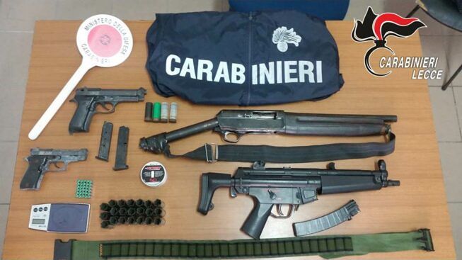 Presso l’abitazione di Protopapa gli uomini dell’Arma del Norm e dei Cacciatori “Puglia, hanno rinvenuto, ben occultate dietro al battiscopa della cucina componibile: un fucile a canna mozza marca Franchi cal. 12 con matricola abrasa e calcio modificato, funzionante; una replica di un fucile mitragliatore “Mp5”, modello softair, di colore nero completo di caricatore, privo di tappo rosso; una pistola a salve marca Valtro mod. 85 combat cal. 8, priva di tappo rosso con caricatore; 30 munizioni a salve cal. 8; 4 munizioni cal. 12 non denunciate; 21 cartucce cal. 12 vuote in quanto utilizzate e non denunciate; un bilancino di precisione marca “diamond” funzionante.