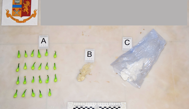 Non solo. È stato trovato anche un sacchetto in cellophane trasparente annodato contenente pezzi in cristallo di colore bianco che, dalle successive analisi di laboratorio, risultava essere cocaina purissima, per un peso complessivo di 65,08 grammi.
