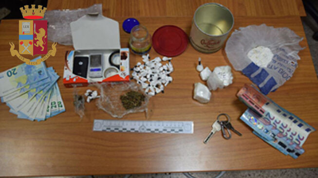 Quando si è ritrovato faccia a faccia con gli agenti, Vergallo ha tentato di disfarsi di una confezione in cellophane trasparente, sigillata all’estremità con del nastro adesivo bianco. Il pacchetto conteneva circa 0,53 grammi lordi di cocaina. Il gesto non è passato inosservato tant’è che i poliziotti hanno recuperato l’involucro scoprendone il contenuto. Il resto è spuntato fuori durante la perquisizione personale. All’interno del taschino della maglietta indossata dal 42enne sono state trovate altre dosi di sostanza stupefacente: cocaina e hashish, confezionate con del cellophane trasparente dello stesso tipo del precedente. E se non bastasse anche 180 euro in contanti. Per la precisione 9 banconote da € 20.