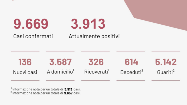 Dall’inizio dell’emergenza sono stati effettuati 456.383 test. Numeri alla mano sono 5142 i pazienti guariti. 3913 sono i casi attualmente positivi. 326 ricoverati.