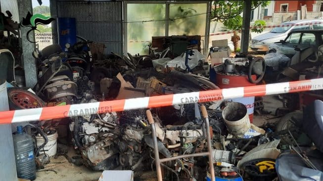 I Militari hanno inoltre riscontrato, all’esterno dell’officina, che l’area che avrebbe dovuto essere destinata a parcheggio dei veicoli riparati o in attesa di riparazione, era stata in gran parte adibita a deposito incontrollato di rifiuti, pericolosi e non pericolosi, fra cui parti di veicoli (compresi motori, marmitte e catalizzatori), residui di tappezzeria e selleria, pneumatici fuori uso, cavi elettrici, bidoni in ferro e plastica con olii esausti, parti di attrezzi agricoli fuori uso, senza alcuna protezione da agenti atmosferici, con presumibile rischio di percolazione di inquinanti frammisti alle acque piovane.