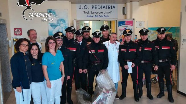 Così i militari si sono recati presso l’ospedale “Vito Fazzi” di Lecce per portare quei doni ai bambini ricoverati nei reparti di Pediatria ordinaria ed oncologica. Intorno alle 10, in particolare, alla presenza di medici, infermieri e personale dell’ospedale, i carabinieri del Reparto leccese hanno fatto ingresso nelle sale dove vi erano ricoverati 25 bambini, ai quali sono stati regalati dei giochi. Alcuni piccoli pazienti, alla vista del regalo tanto desiderato, si sono gettati tra le braccia dei carabinieri in segno di riconoscimento.