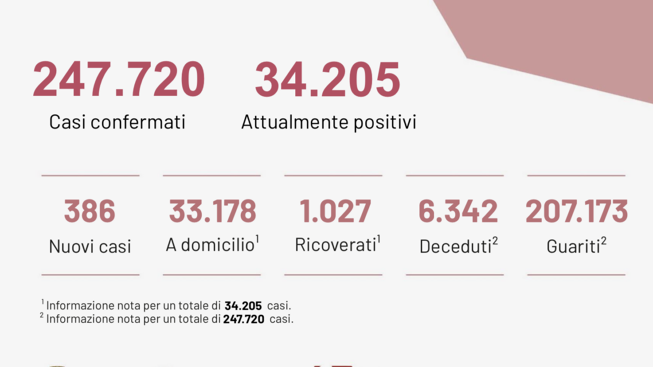 Dall’inizio dell’emergenza sono stati effettuati 2.415.076 test. 207.173 sono i pazienti guariti. 34.205 sono i casi attualmente positivi. Scendono ancora i ricoveri in Ospedale, fermi a 1.027.