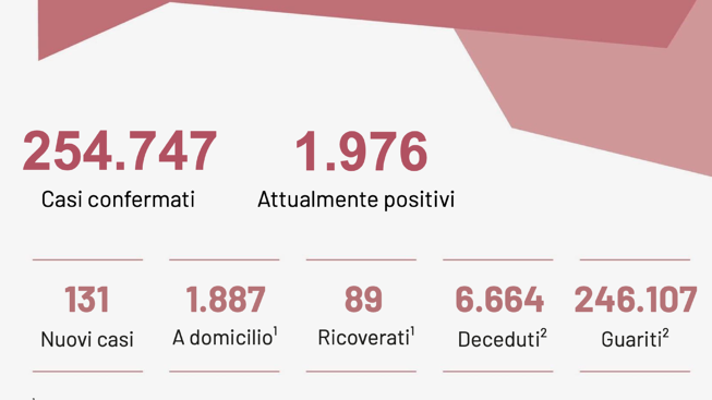 Salgono a 3 i nuovi ricoveri, per un totale di 89 persone, mentre ieri erano 86. Non sono stati registrati decessi. Dall’inizio dell’emergenza sono stati effettuati 2.815.016 test. 246.107 sono i pazienti guariti. 1.976 sono i casi attualmente positivi.