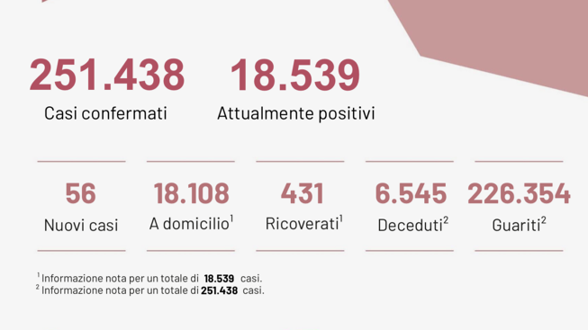 Dall’inizio dell’emergenza sono stati effettuati 2.533.789 test. 226.354 sono i pazienti guariti. 18.539 sono i casi attualmente positivi. Le persone ricoverate in Ospedale sono 431.