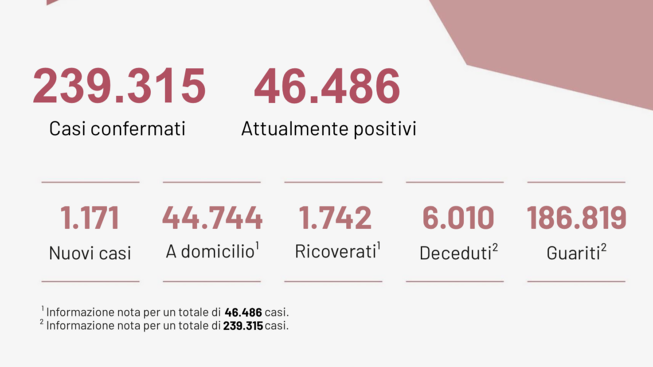 Dall’inizio dell’emergenza sono stati effettuati 2.273.761 test. 186.819 sono i pazienti guariti. 46.486 sono i casi attualmente positivi. Scendono ancora i ricoveri in Ospedale fermi a 1.742 contro i 1.782 di ieri.