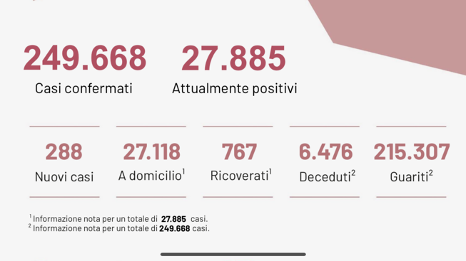 Dall’inizio dell’emergenza sono stati effettuati 2.468.973 test. 215.307 sono i pazienti guariti. 27.885 sono i casi attualmente positivi. Scendono i ricoveri fermi a 767.