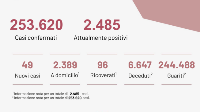 Dall’inizio dell’emergenza sono stati effettuati 2.714.846 test. 244.488 sono i pazienti guariti. 2.485 sono i casi attualmente positivi. Sono 96 i ricoveri in Ospedale.