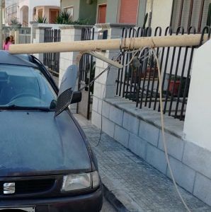 Ad un certo punto, però, il palo ha ceduto e si è schiantato contro la macchina sottostante, una Seat di colore scuro che si trovava parcheggiata in quella via. E per fortuna il proprietario non si trovava nell’abitacolo, evitando una possibile tragedia.