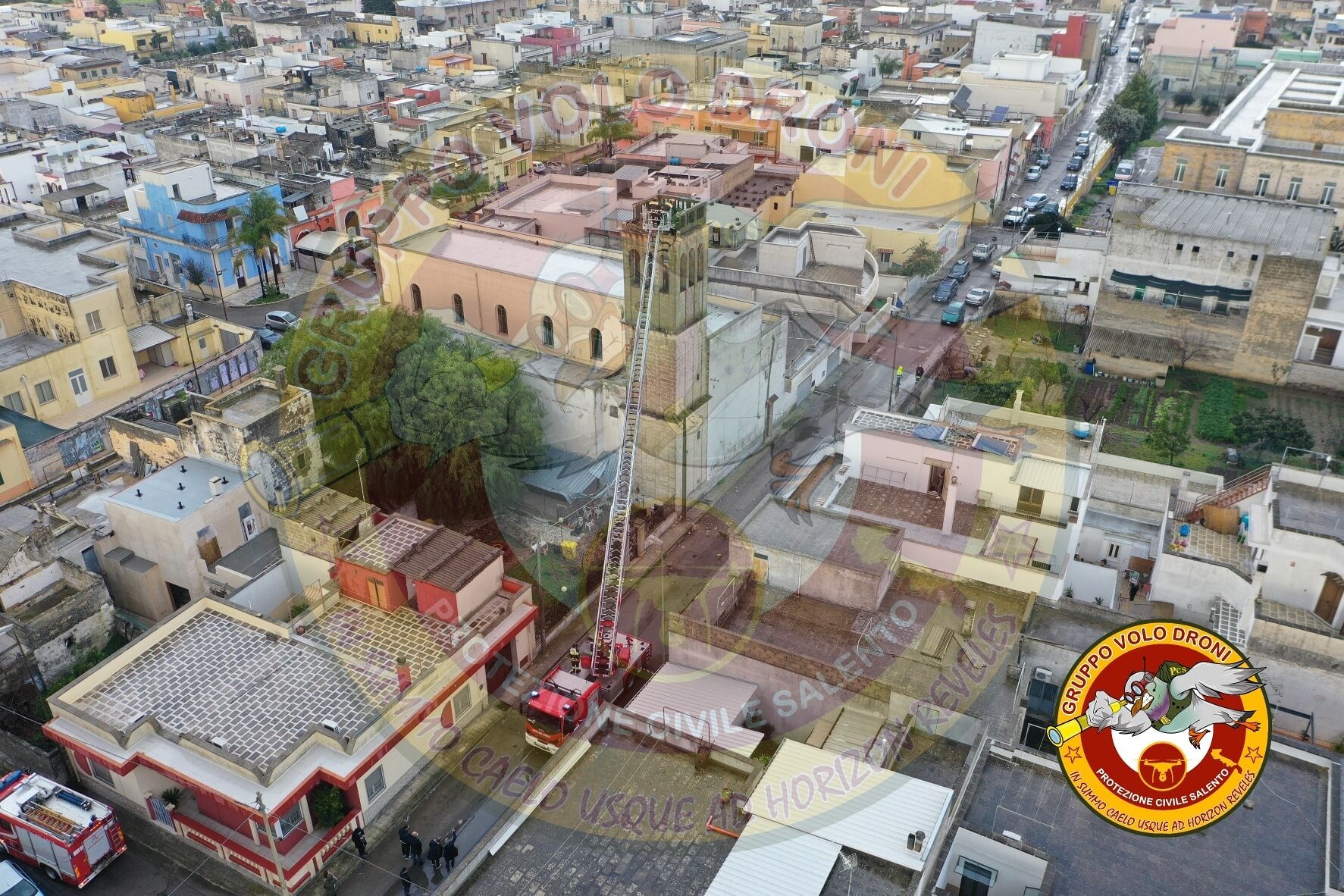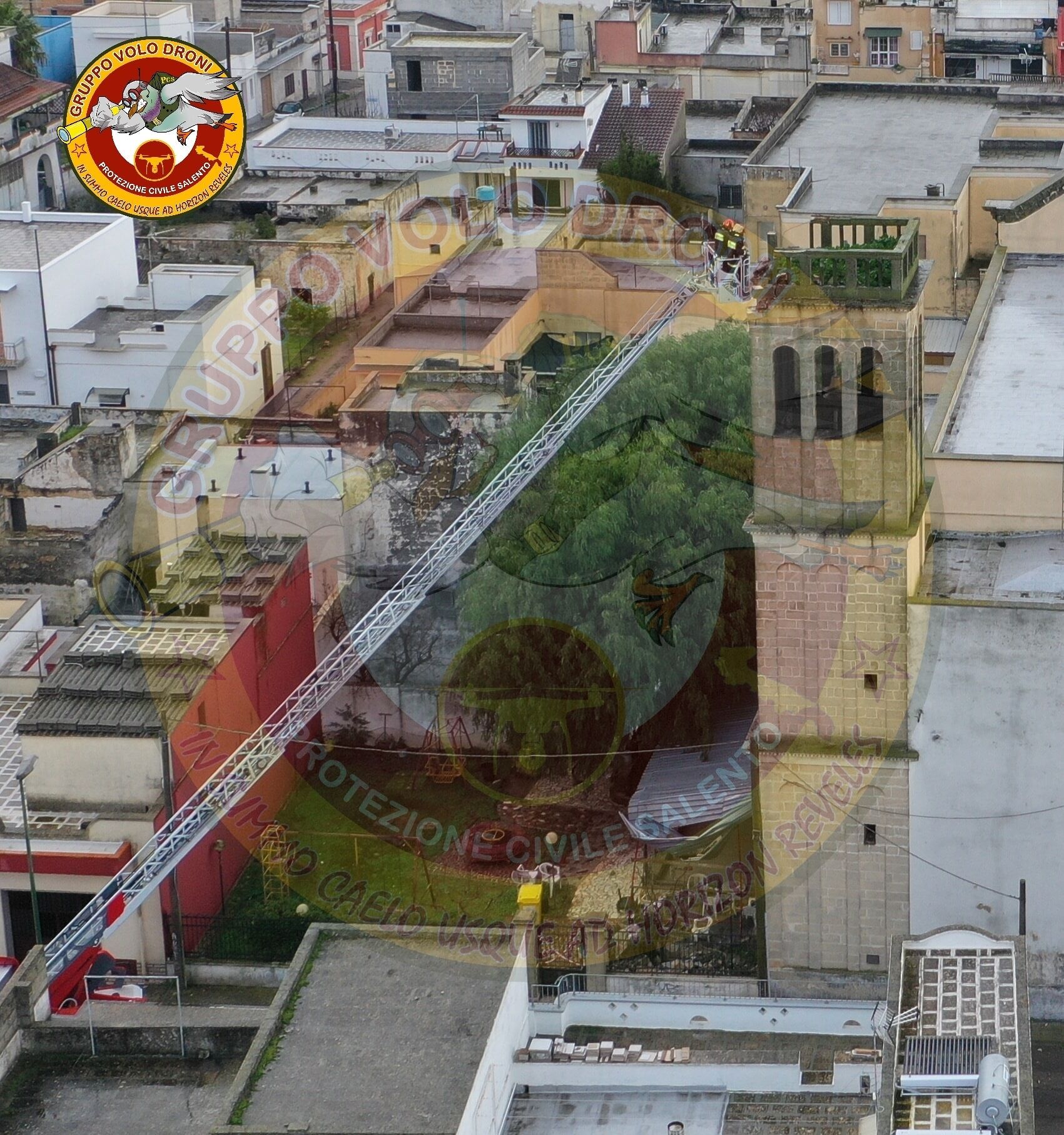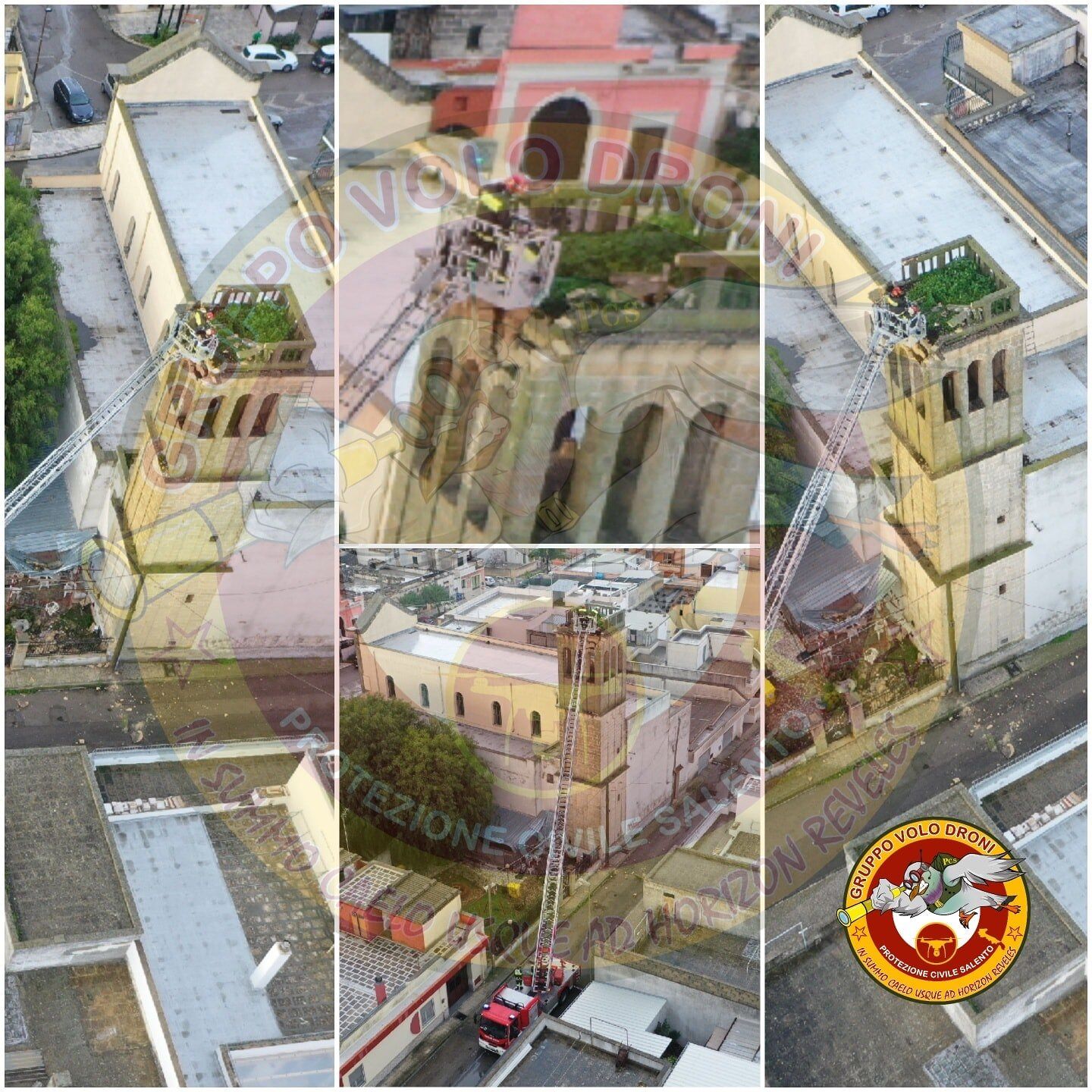 Su richiesta del sindaco del comune salentino, Bruno Corrado, la Protezione Civile ha effettuato un volo di ricognizione mediante l’utilizzo di droni per determinare l’entità del danno. Le immagini servono a documentare i danni causati alla sommità del campanile.