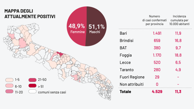 Il totale dei casi positivi Covid in Puglia è di 4.529 (su 168.388 tamponi), così suddivisi: