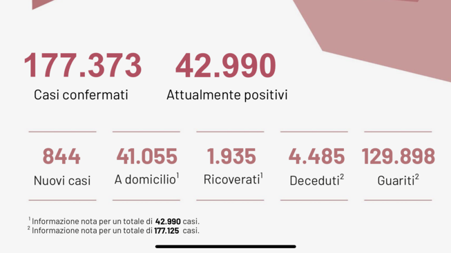 Dall’inizio dell’emergenza sono stati effettuati 1.768.460 test. 129.898 sono i pazienti guariti. 42.990 sono i casi attualmente positivi. Sono 1.935 le persone ricoverate in Ospedale. Ancora un segno più.