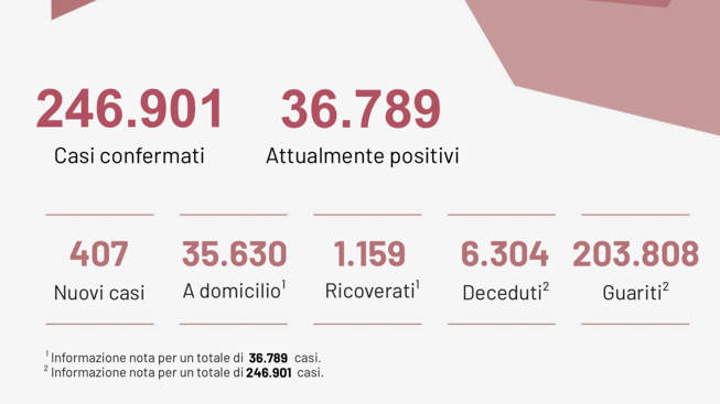 Dall’inizio dell’emergenza sono stati effettuati 2.396.787 test. 203.808 sono i pazienti guariti. 36.789 sono i casi attualmente positivi. Scendono ancora i ricoveri in Ospedale fermi a 1.159. Ieri erano 1.223.