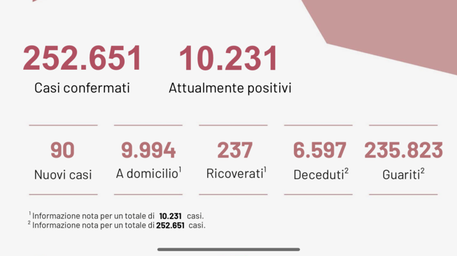 Dall’inizio dell’emergenza sono stati effettuati 2.597.073 test. 235.823 sono i pazienti guariti. 10.231 sono i casi attualmente positivi. I ricoveri in Ospedale scendono ancora e si fermano a 237.