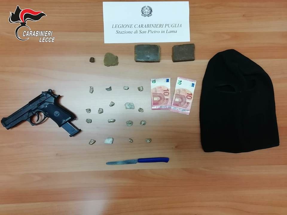 Il ragazzo è stato trovato in possesso di 204 grammi di hashish, di 20 euro, di un passamontagna e di una pistola a salve priva di tappo rosso, tutto posto sotto sequestro. L’arrestato, espletate le formalità di rito, è stato poi condotto al Centro di prima accoglienza di Monteroni di Lecce in attesa di citazione diretta a giudizio.