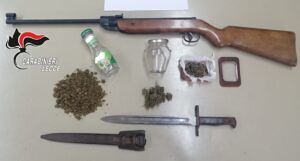 A Ruffano, infatti, la denuncia è scattata nei confronti di M. S., in quanto a seguito dopo la verifica domiciliare è stato trovato in possesso di: 1 carabina ad aria compressa “Diana” mod. 21, priva di matricola; 1 baionetta “Bern”, con matricola; 2 vasetti in vetro contenenti complessivamente 40 gr. di marijuana.