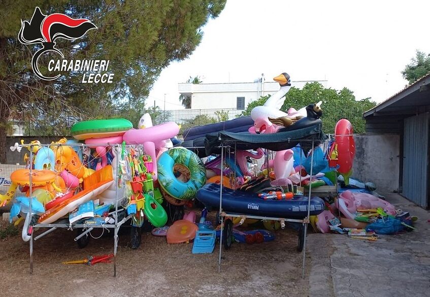 A Porto Cesareo gli uomini dell’arma hanno deferito tre persone. Il primo, un 39enne di Nardò, durante un controllo è stato trovato con un coltello a serramanico proibito (la lama era lunga sei centimetri), poi sequestrato. Una 29enne nata in Senegal, invece, è finita nei guai perché tentava di vendere 75 borse e borselli da donna con marchi contraffatti occupando l’area demaniale senza autorizzazione. Merce sottoposta a sequestro. Stessa sorte toccata ad un 23enne senegalese, che tentava di vendere 72 paia di scarpe con marchi contraffatti, occupando l’area demaniale senza autorizzazione. In questo caso, quando i militari gli hanno chiesto i documenti, il ragazzo non ha esibito alcun permesso di soggiorno. Non solo, sono state sequestrate 7 bancarelle mobili allestite per la vendita di gonfiabili e giochi da mare e per bambini, per un totale di circa duemila oggetti. Anche in questo caso occupavano l’ area demaniale senza autorizzazione. Materiale sottoposto a sequestro.