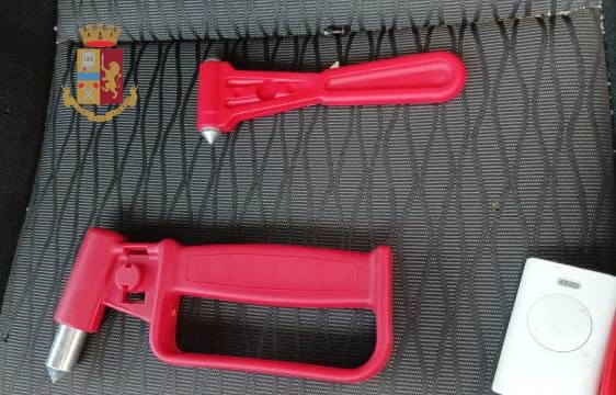 Non è finita, durante i pattugliamenti nei pressi del terminal degli autobus, gli agenti della squadra volante hanno controllato due giovani campani che, alla vista delle divise, hanno cercato di evitare il controllo, mostrandosi un po’ nervosi. Il motivo del loro comportamento è stato chiaro poco dopo: in uno zaino è spuntato fuori un martelletto di emergenza frangivetro con due puntali bilaterali in metallo, di cui i fermati non hanno saputo giustificarne il possesso. Probabilmente, sarebbe servito per compiere furti di autovetture. I 20enni sono stati denunciati per porto abusivo di oggetti atti ad offendere.