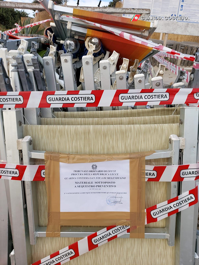 Nell’ambito della stessa attività, che rientra nell’Operazione “Mare Sicuro”, i militari dell’Ufficio Circondariale di Otranto hanno effettuato un controllo presso la spiaggia in concessione che si trova in località Baia dei Turchi del Comune di Otranto. In particolare, il concessionario della spiaggia aveva occupato abusivamente 600 mq di spiaggia libera, con ombrelloni e lettini che toglievano la spiaggia libera ai bagnanti. Il concessionario è stato quindi deferito alla competente Procura della Repubblica presso il Tribunale di Lecce per occupazione abusiva di suolo demaniale marittimo. È stato pertanto operato il sequestro di 73 lettini da spiaggia e 34 ombrelloni.