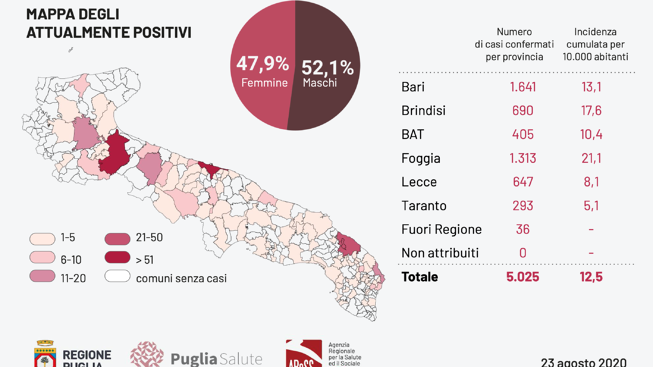 Il totale dei casi positivi Covid in Puglia è di 5025 così suddivisi:
