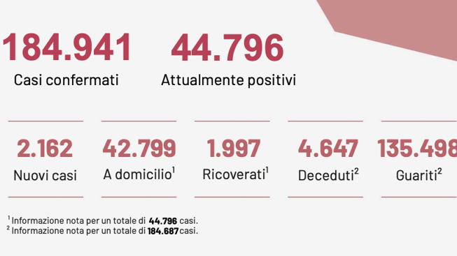 Dall’inizio dell’emergenza sono stati effettuati 1.817.711 test. 135.498 sono i pazienti guariti. 44.796 sono i casi attualmente positivi.