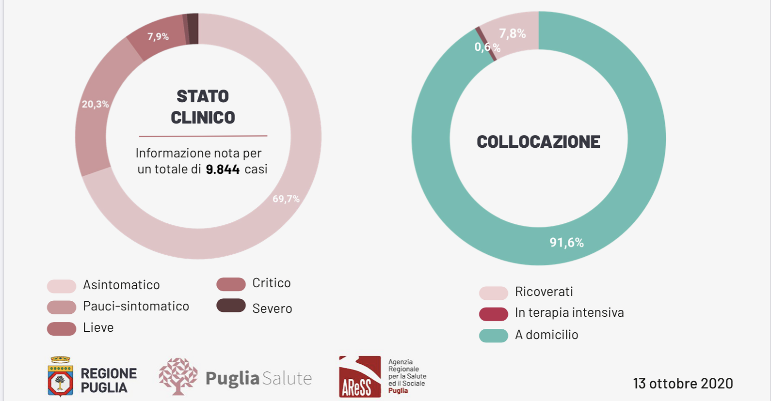 Il totale dei casi positivi Covid in Puglia è di 9.849, così suddivisi: