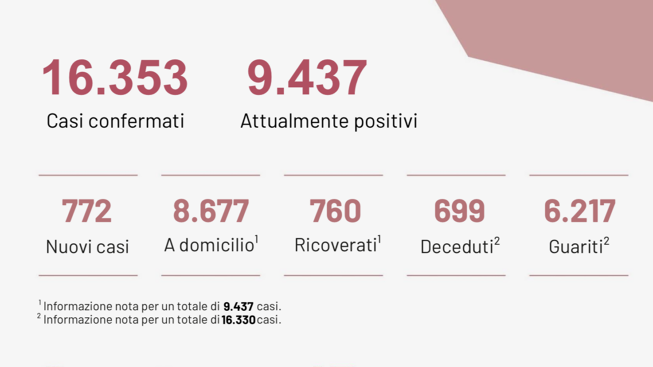 Nell’ultimo report, su 6.437 test per l’infezione da Covid-19 sono stati registrati 772 casi positivi: 359 in provincia di Bari, 39 in provincia di Brindisi, 86 in provincia BAT, 117 in provincia di Foggia, 39 in provincia di Lecce, 127 in provincia di Taranto, 4 attribuiti a residenti fuori regione, 1 caso di provincia di residenza non nota.