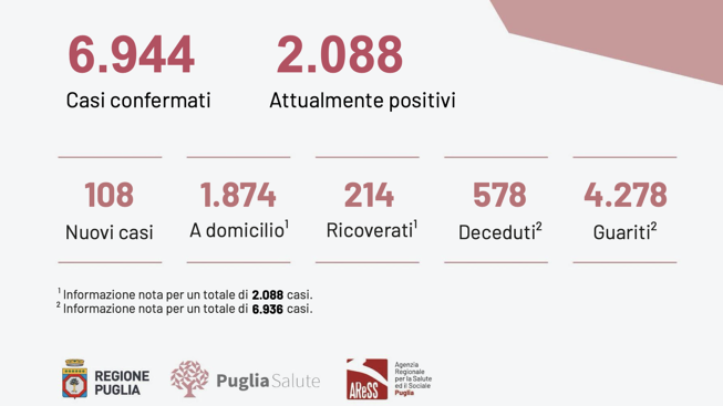 Come prassi impone per evitare che il virus “cammini”, tutti gli invitati e i familiari sono stati o saranno sottoposti al tampone. Per ora, la curva disegnata dai contagi resta più o meno stabile, aumenta o diminuisce leggermente anche in base al numero di test che vengono effettuati. Nell’ultimo aggiornamento del bollettino epidemiologico della Regione su 3.717 tamponi effettuati nelle ultime 24 ore, sono 108 quelli risultati positivi in Puglia. Anche oggi, purtroppo, si registra un decesso legato al virus nella provincia Bat.