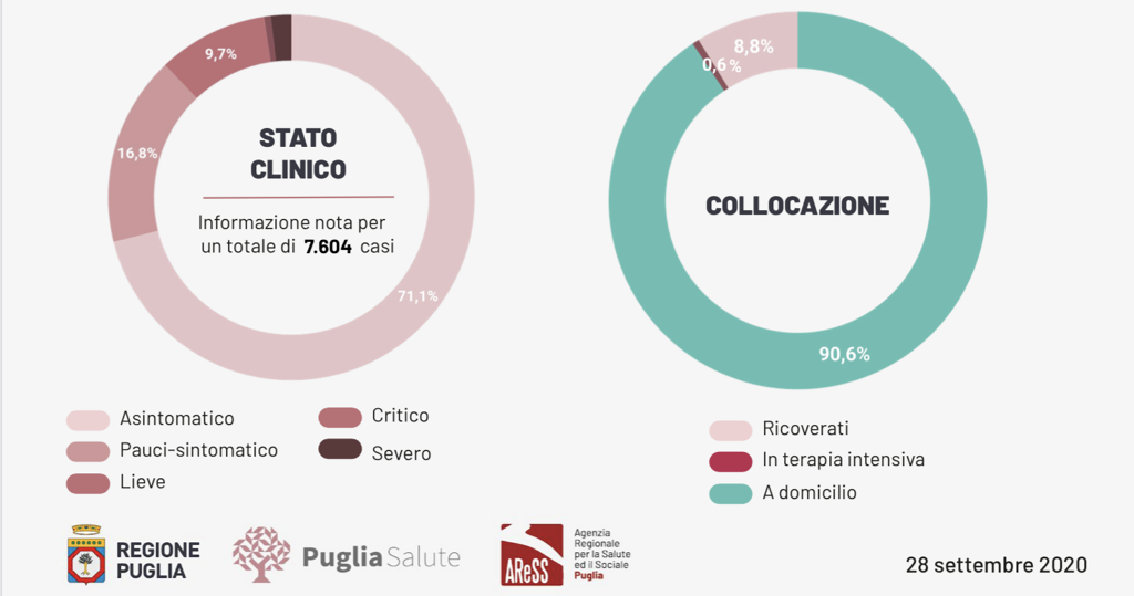Il totale dei casi positivi Covid in Puglia è di 7.611, così suddivisi: