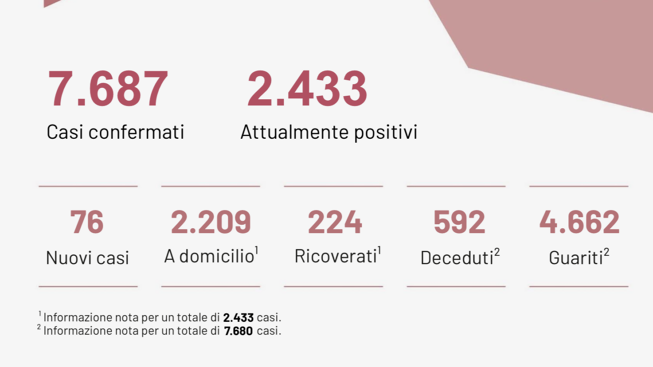 Non sono stati registrati decessi. Numeri alla mano, sono 4.622 i pazienti guariti. 2.433 i casi attualmente positivi. Dall’inizio dell’emergenza sono stati effettuati 404.787 test.
